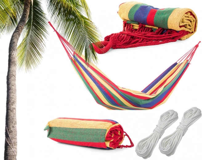 Deze gestreepte hangmat brengt direct rust en comfort naar je tuin of balkon. De duurzame, ademende stof en sterke gevlochten touwen zorgen voor veilig en aangenaam schommelen voor één of twee personen. Opgerold neemt ze minimale ruimte in en dankzij de meegeleverde koorden hang je haar eenvoudig op tussen bomen of aan een standaard.