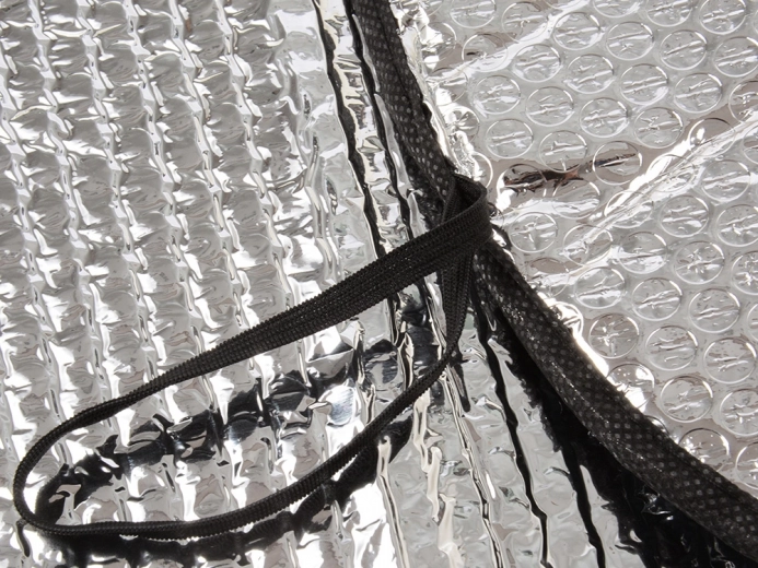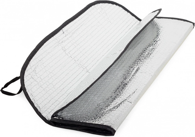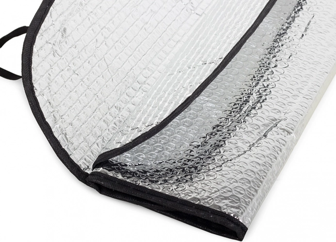 Het gemetalliseerde oppervlak met noppenisolatie weerkaatst zonnestralen, verlaagt de temperatuur in het interieur en beschermt dashboard en bekleding tegen verkleuring.