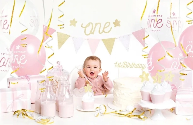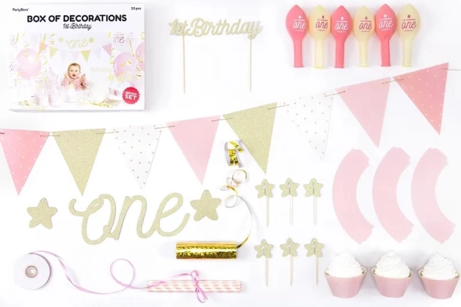 Stijlvolle set verjaardagsdecoraties in een elegante roze‑gouden combinatie voor de eerste verjaardag. Bevat alles wat je nodig hebt voor een snelle en harmonieuze aankleding – van een “One”-banner en een papieren slinger tot ballonnen, taarttopper, decoraties en cupcakevormpjes, rietjes, gouden serpentines en een satijnen lint. Alles is handig verpakt in een doos.