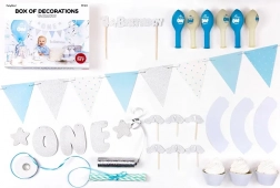 In de doos vind je decoraties voor zowel tafel als ruimte die perfect bij elkaar passen. Met de topper en cupcakeversieringen style je de zoete tafel; ballonnen en slingers benadrukken de feestelijke uitstraling van de kamer.