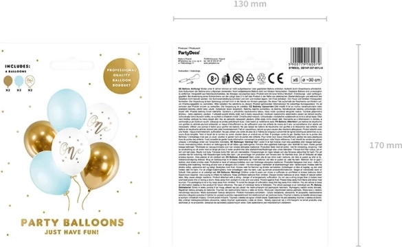 In de verpakking vind je 6 ballonnen met een diameter van ca. 30 cm: 2x Pure White met gouden “One”-opdruk, 2x Light Blue en 2x glanzend goud. Combineer ze eenvoudig met andere accessoires voor een fothoek, sweet table of tafeldecoratie.