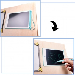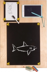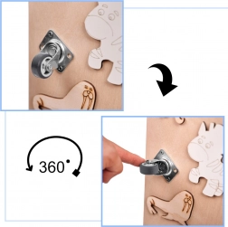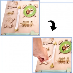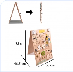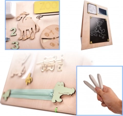 Een unieke functie van dit bord is de dubbelzijdigheid - één zijde bevat talrijke manipulatieve elementen en de andere dient als een oppervlak om te tekenen en te schrijven met krijt, stiften of potloden. Dit helpt kinderen hun creativiteit en fijne motoriek te ontwikkelen.