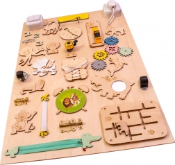 Het bord bevat kleurrijke tandwielen, belletjes, sloten en andere interactieve elementen die de fijne motoriek bevorderen.