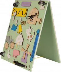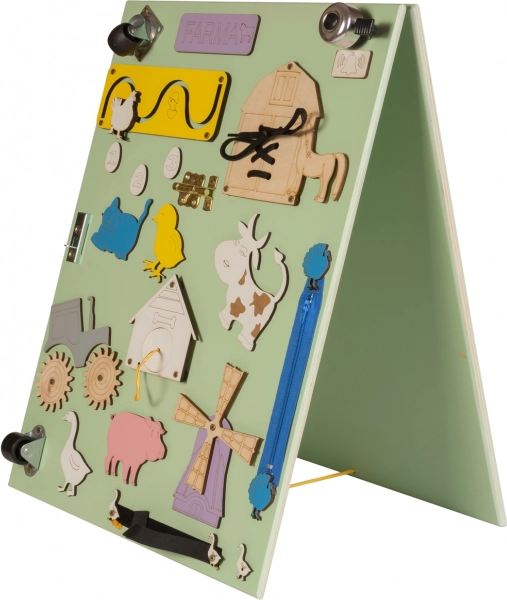 Het houten tweezijdige manipulatieve bord met boerderijthema trekt de aandacht van uw kind niet alleen door de kleuren, maar ook door de uiteenlopende activiteiten. Het bord bevat afbeeldingen van verschillende dieren zoals een koe, kip of paard en biedt tevens interactie met beweegbare elementen zoals draaibare tandwielen, rits en deuren met sloten. Uw kind kan leren veters strikken, sloten openen en sluiten en spelen met verschillende componenten.