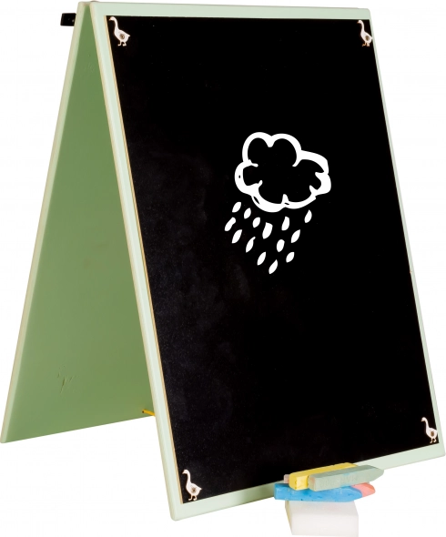 Aan de andere kant van het bord bevindt zich een krijtoppervlak om op te tekenen. De verpakking bevat krijt en een spons. Het bord is gemaakt van hoogwaardig hout, wat het een ecologisch alternatief maakt voor plastic speelgoed en biedt een hogere duurzaamheid.