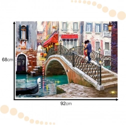 De puzzel toont een artistieke illustratie van een romantische brug in Venetië met een paar op de brug. Dit motief geeft het beeld charme en mysterie.