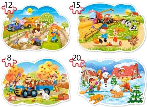 Deze 4-in-1 set biedt vier losse puzzels in één verpakking, perfect voor het geleidelijk verhogen van de moeilijkheid. Na het leggen ontstaan kleurrijke afbeeldingen met thema’s van de boerderij, dieren, tractors en kinderspel, elk met een afmeting van 28 × 19,5 cm. Kwaliteitsdruk en stevige stukjes garanderen een lange levensduur en veel plezier bij herhaald puzzelen.
