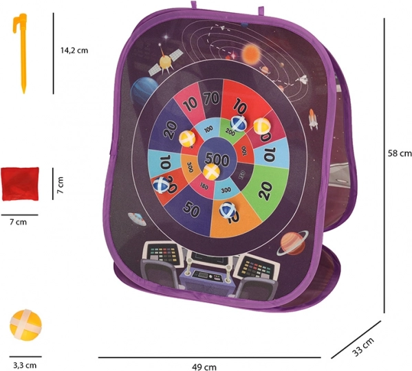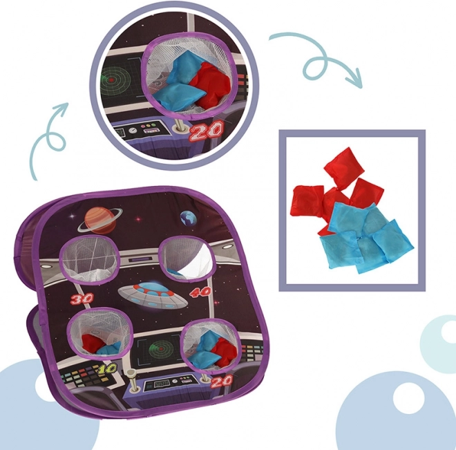De dubbelzijdige speelgoedset met ruimtethema brengt spanning en plezier voor kinderen, zowel binnen als in de tuin. Er zijn twee soorten doelen beschikbaar: de ene kant van het lichtgevende ronde bord vangt de contactvlakken van zachte klittenbandballen, terwijl de andere kant kinderen uitdaagt om met een zakje door de openingen te mikken.