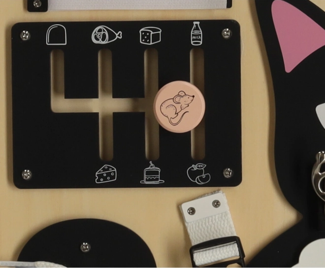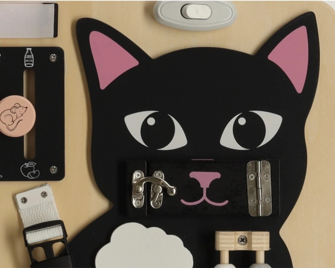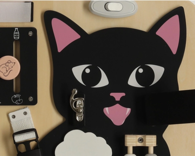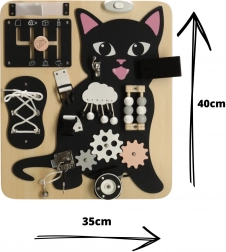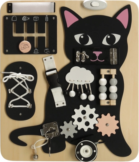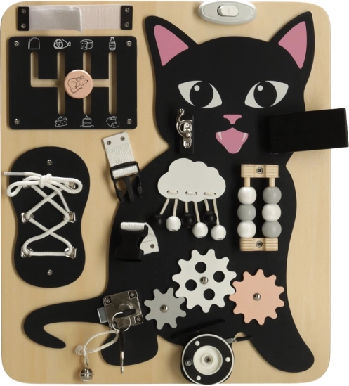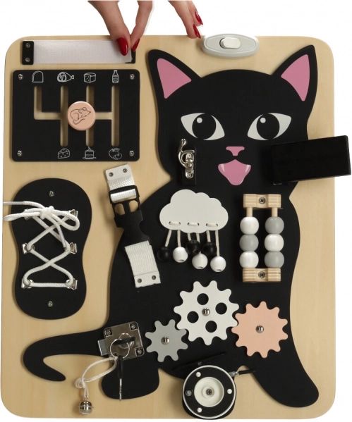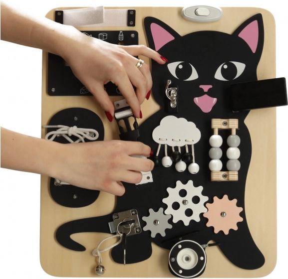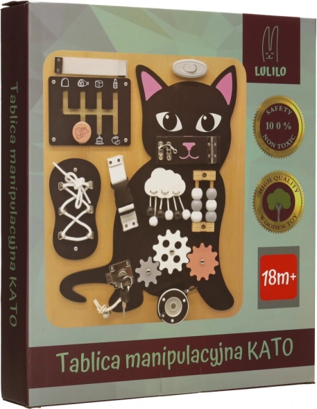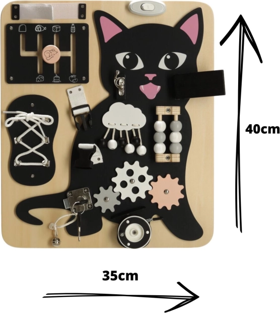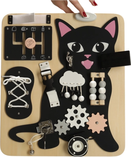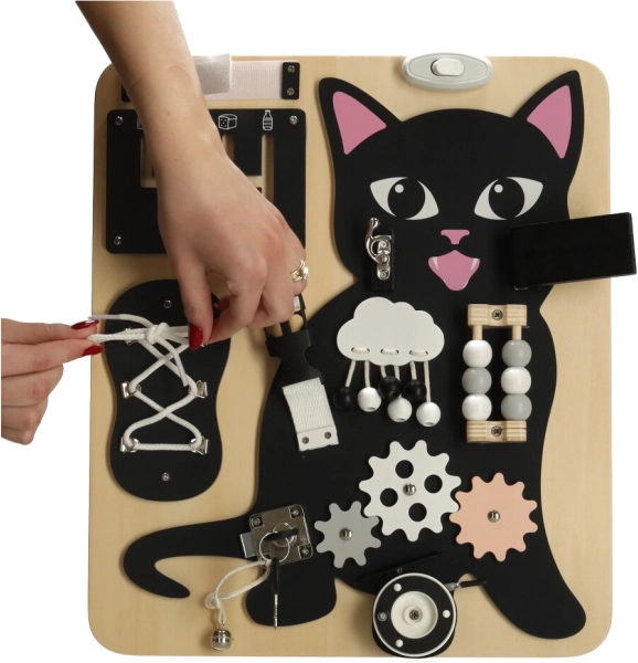 Het Lulilo-bord in de vorm van een kat is een populaire educatieve speelgoed voor kinderen die uitnodigt tot draaien, trekken, knopen leggen en schuiven. Het helpt hen bij het ontwikkelen van fijne motoriek, precisie van beweging en kracht in de handen. Leuke puzzels en opdrachten stimuleren cognitieve vaardigheden van kleine kinderen en geven hen voldoening van successen.