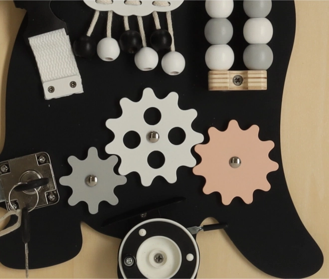 Met behulp van interactieve elementen zoals tandwielen, sloten en veters leren kinderen fijne motoriek en verbeteren ze de precisie van hun handbewegingen.