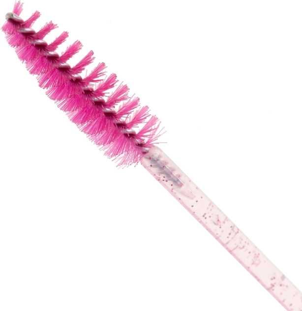 Dichte roze borstelhaartjes scheiden wimper- en wenkbrauwhaartjes gelijkmatig en helpen cosmetica egaal aan te brengen zonder klontjes.