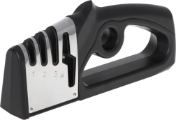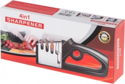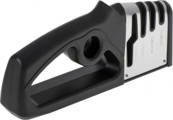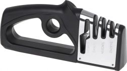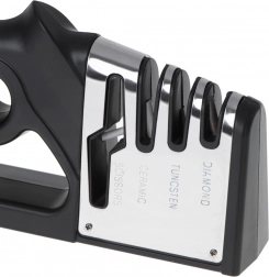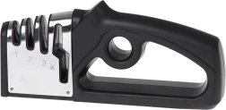 De universele 4-in-1 slijper is ontworpen voor complete verzorging van keukenmessen en scharen. Drie opeenvolgende fasen van verschillende materialen herstellen de snede van grof uitlijnen tot fijn polijsten, zodat u scheerachtige scherpte zoals in een professionele keuken bereikt. De vierde sleuf is bedoeld voor snel en precies slijpen van scharen.