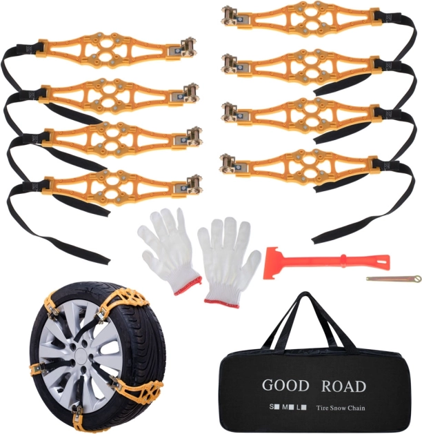 In de verpakking vind je 8 antislipbanden, handschoenen, een ijskrabber en een stevige draagtas. Alles netjes in de kofferbak en klaar voor gebruik.