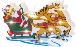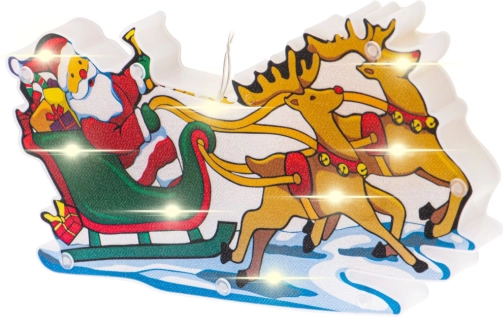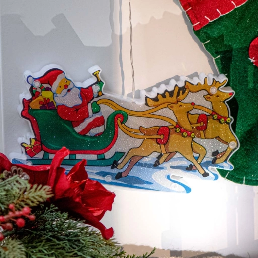 Deze kleurrijke kerstdecoratie met de Kerstman in een slee en rendieren geeft warmwit licht en voegt een knusse, feestelijke touch toe aan je interieur. Dankzij het dubbelzijdige motief ziet hij er aan beide kanten van het raam geweldig uit en trekt hij de aandacht van elke voorbijganger.