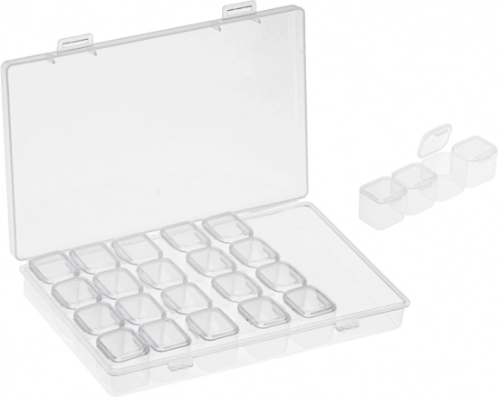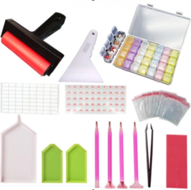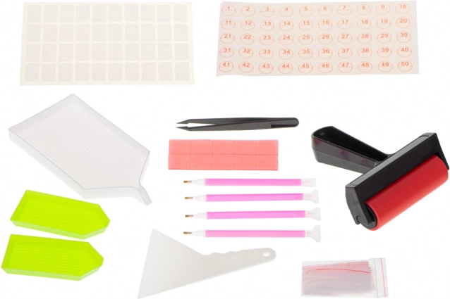 Inhoud van de set: Roller, 2 standaard dienbladen, 1 groot dienblad met trechter, 4 pennen, 1 pincet, stickers, 1 spatel, kristalscheider, 20 zakjes met ritssluiting. Alles verpakt in een zak met ritssluiting.