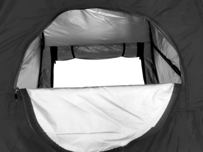 - Voor zit een ritssluiting. Aan de achterkant is een kleine opening, eveneens met rits, die uitstekend als raam kan dienen. De tent heeft geen bodem.
