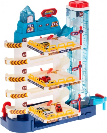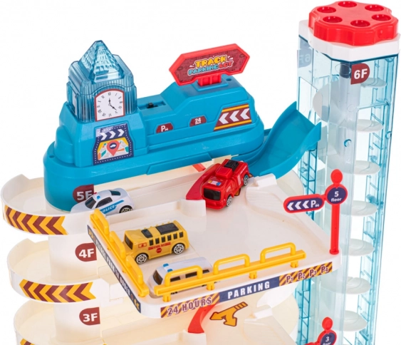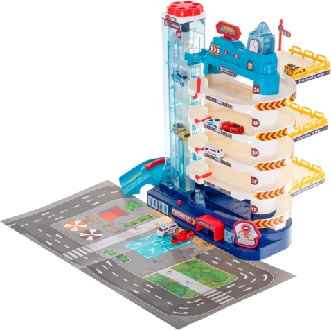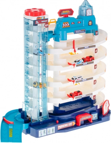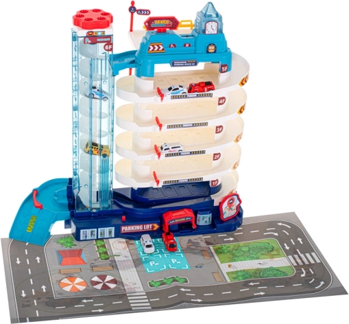 Grote meerlaagse parkeergarage voor kinderen met tot 5 parkeerniveaus, een elektrische en handmatige lift, licht- en geluidseffecten en bovendien 8 metalen/kunststof autootjes en een speelmat met stad. Een geweldig speelgoed voor de ontwikkeling van fantasie, fijne motoriek en logisch denken.