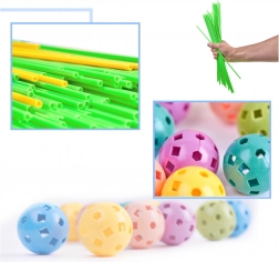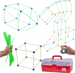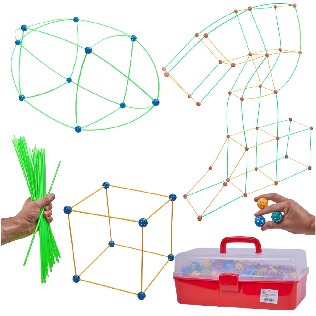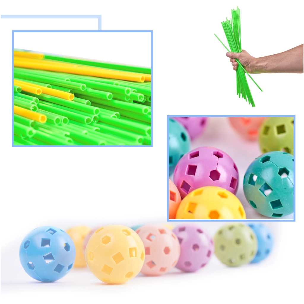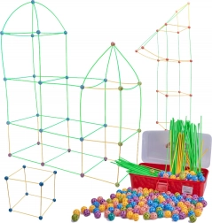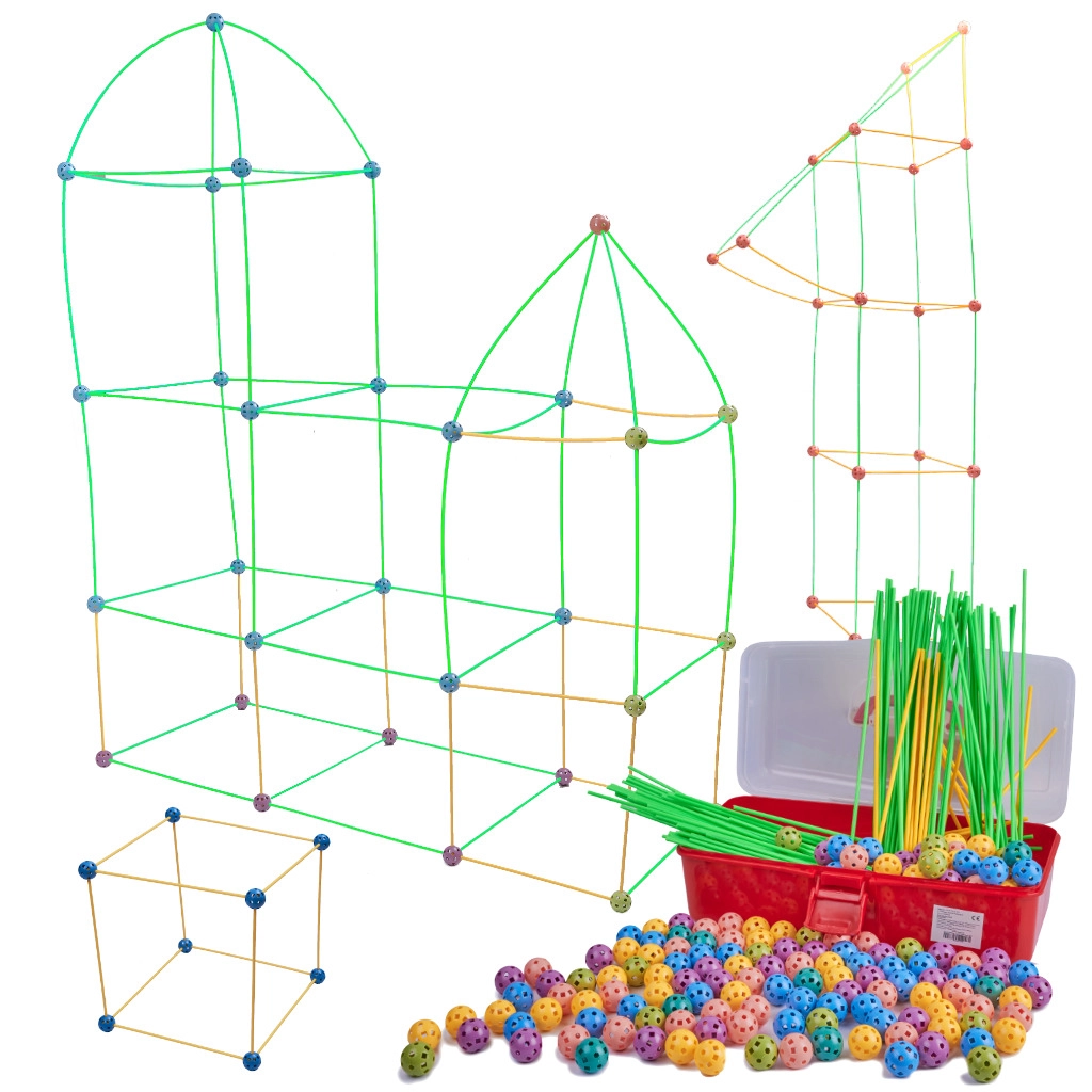 Deze constructieset combineert lange kunststof staafjes met duurzame geperforeerde ballen met veel openingen voor eenvoudig vastklikken. Kinderen kunnen 3D-constructies maken – van huisjes en tenten tot tunnels en forten – de fantasie kent geen grenzen. De onderdelen zijn licht, veilig en herbruikbaar.