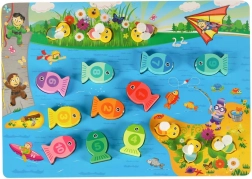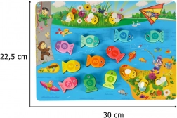 Deze creatieve montessoriset biedt kinderen drie speelwijzen: vissen met een magnetische hengel, het plaatsen van genummerde visjes in de juiste openingen en het trainen van de fijne motoriek met bijtjes met behulp van een pincet. Bonte elementen motiveren tot spel, terwijl de hoogwaardige houten afwerking met afgeronde randen veiligheid garandeert.