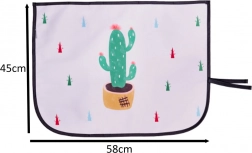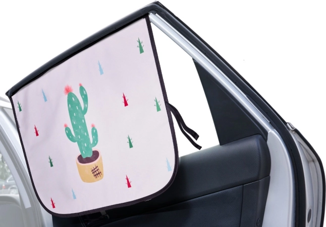 Praktische en veilige bescherming voor reizen met kinderen en volwassenen. De dubbellaagse polyesterstof met cactusprint zorgt voor volledige verduistering, tempert verblindend zonlicht en voorkomt oververhitting van de auto. Aan de binnenzijde staat de tekst “Go out and enjoy the sunshine” op een zwarte achtergrond.