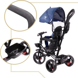 Voor maximale controle is er een 360° draaibare zitting, die rijden naar de ouder toe of met de rijrichting mee mogelijk maakt. Het vrije wiel (vrijloop) laat ouders met één schakelaar de aandrijving overnemen. Luchtvrije wielen zorgen voor comfort als bij luchtbanden, maar zonder zorgen over bandenspanning en lekken. Verder is er een drie-standen inklapbare kap met gaas, een afneembare duwstang met foam bekleding en praktische opbergaccessoires.