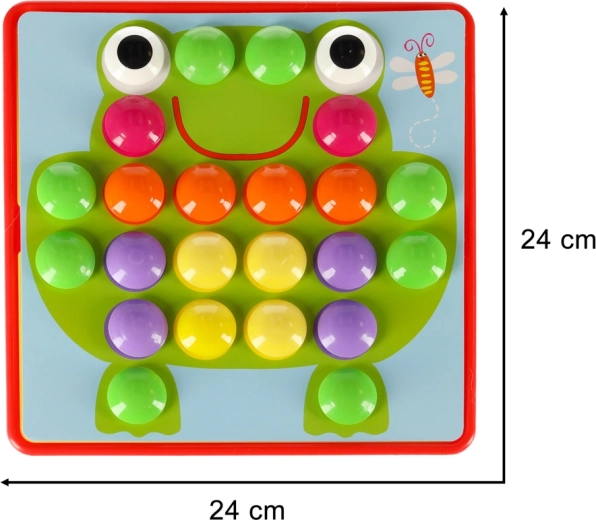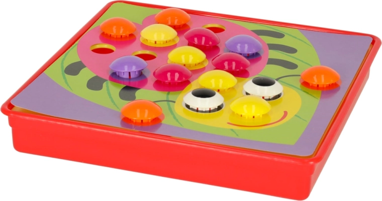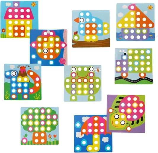 Grote pinnetjes zijn gemakkelijk vast te pakken en kinderen plaatsen ze in de gaten op kleur – zo oefenen ze pincetgreep, oog-handcoördinatie en aandacht. Ideale eerste mozaïek voor kleuters.
