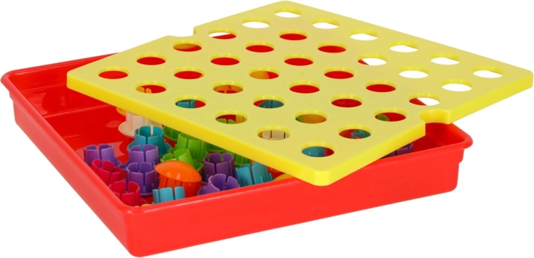 De set bevat 10 kleurrijke voorbeeldkaarten met vrolijke motieven die creativiteit en het leren van kleuren, vormen en tellen stimuleren. De stabiele basis dient ook als opbergbox, zodat alle onderdelen netjes bij elkaar blijven.