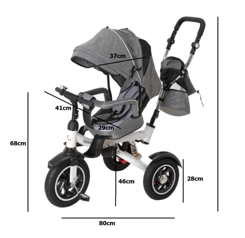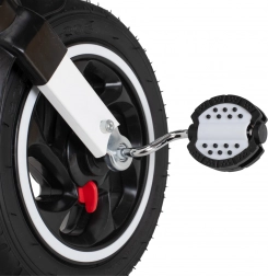 De grote tubeless wielen met uitstekende grip zijn lekbestendig en hoeven niet te worden opgepompt. Voor de veiligheid zorgen achterste parkeerremmen, 2-puntsgordels, een beschermbeugel en antislippedalen. Verder aanwezig: bel, praktisch ritsvak en een kap met gaas om zicht te houden op het kind.
