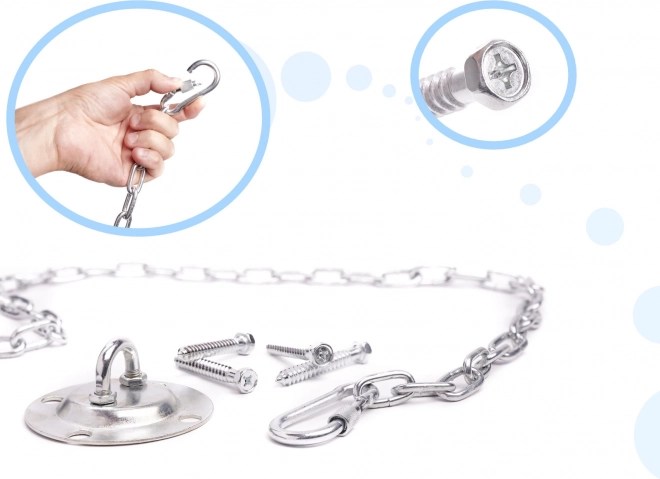 Compleet pakket met haak, schroeven, ketting en karabiners vereenvoudigt de installatie. Geschikt voor montage in hout en beton (bij gebruik van de juiste pluggen).