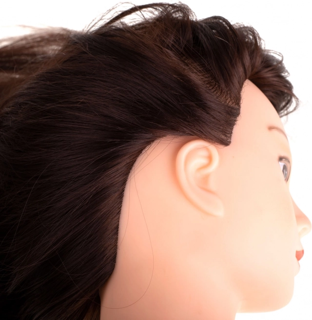 Professioneel oefenhoofd voor kappers met lange bruine haren, ideaal voor het oefenen van knippen, kapsels en technieken met warmte-styling. De haren liggen in de groeirichting, waardoor ze gemakkelijk doorkambaar zijn, vol aanvoelen en nauwkeurig scheiden van lokken mogelijk maken. Een geweldige tool voor beginners en gevorderden en onmisbare uitrusting voor cursussen, wedstrijden en demonstraties.