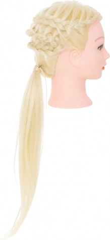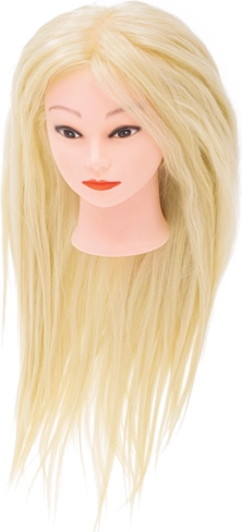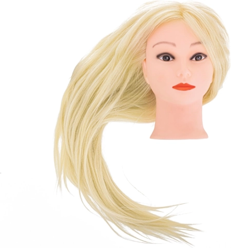 Professioneel trainingshoofd voor kappers met lang blond haar, ideaal voor zowel beginners als gevorderden. Geschikt voor kammen, knippen, vlechten, touperen, opsteken en werken met hitte zoals krullen, föhnen en stijlen. De haren zijn in groeirichting ingeplant, waardoor ze makkelijk doorkambaar zijn en minder klitten veroorzaken.
