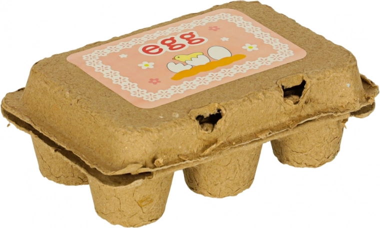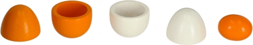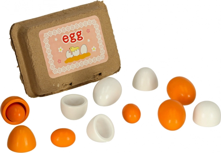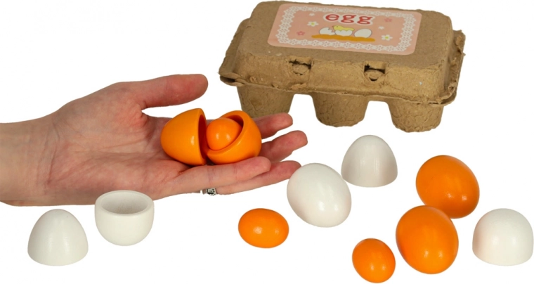 - 1× kartonnen eierdoos voor 6 eieren, 6× houten ei (3 hele, 3 met uitneembare dooier)