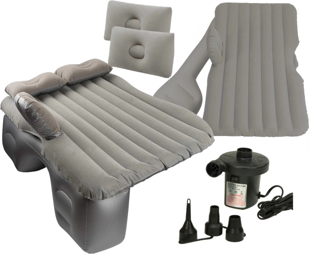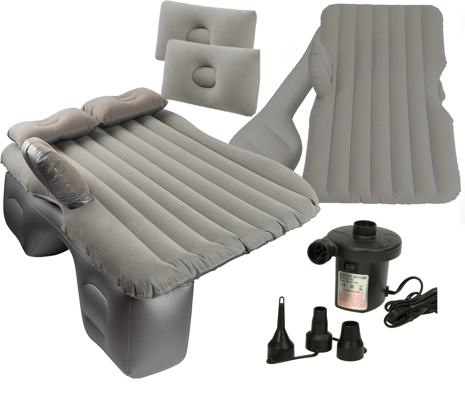 Grijze opblaasbare automatras 130 × 80 cm met elektrische pomp, draagkracht 300 kg, velours toplaag, afneembare steun, 2 kussentjes, tas en reparatieset.