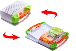 Het geperforeerde bord dient tijdens het spelen als basis en verandert na afloop in een koffer. Zo ruim je de onderdelen gemakkelijk op en neem je ze overal mee naartoe.