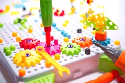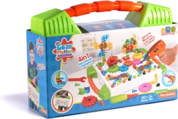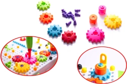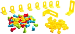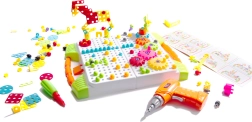 De set met schroeven, verbindingsstukken en vormdelen in levendige kleuren maakt het mogelijk om patronen, afbeeldingen en eenvoudige 3D-constructies te bouwen en spelenderwijs kleuren en vormen te leren.