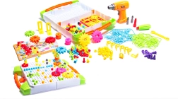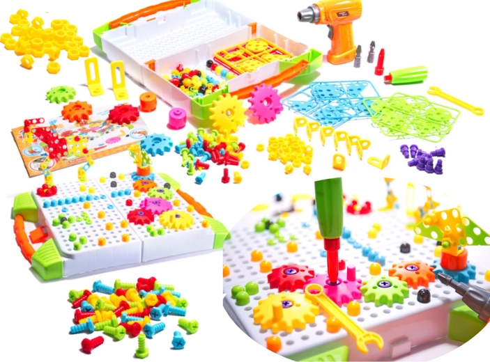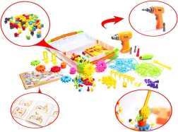 Deze slimme set combineert plezier met leren. Met de batterij-aangedreven kinderboormachine of de schroevendraaier draaien kinderen eenvoudig kleurrijke schroeven in het geperforeerde bord en maken verschillende patronen, dieren of voertuigen. Heldere kleuren ondersteunen het leren van kleuren en vormen, terwijl het schroeven zelf de vingerbehendigheid en oog-handcoördinatie versterkt.