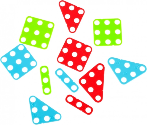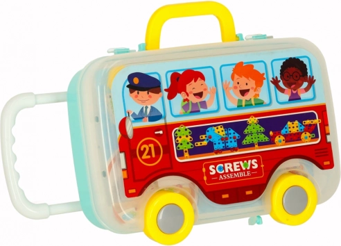De set met gekleurde schroeven, knopjes en vormen maakt het mogelijk om bloemen, dieren en geometrische patronen te maken en leert kleuren en vormen herkennen.