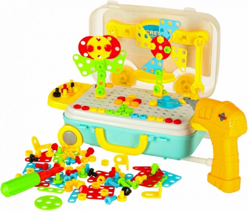 Wek de creativiteit van kinderen op met deze kleurrijke bouwset in een praktische koffer. Kinderen schroeven met behulp van een batterijboormachine of een schroevendraaier gekleurde schroeven in een geperforeerde plaat en maken zo afbeeldingen en 3D-modellen. Het spel stimuleert de fijne motoriek, logica en verbeeldingskracht en biedt dankzij de 258 onderdelen uren speelplezier thuis en onderweg.