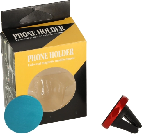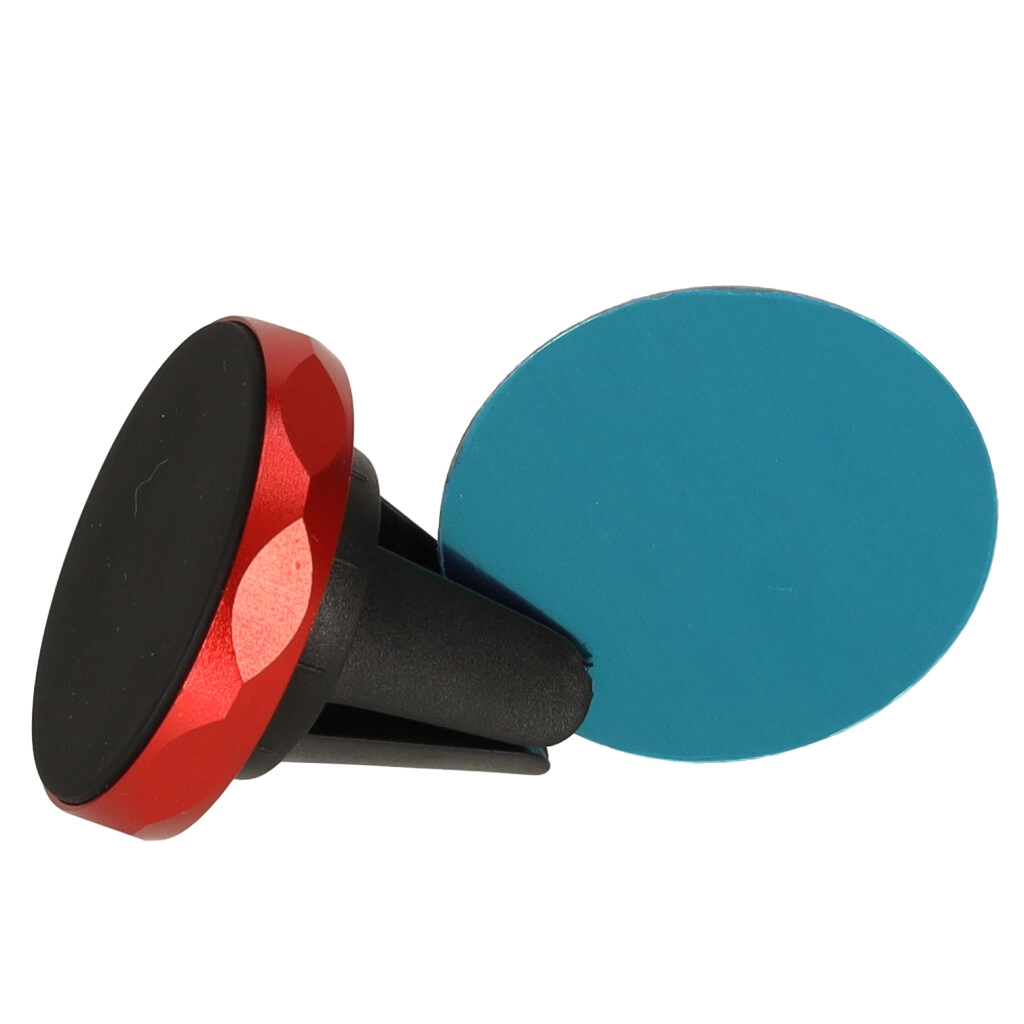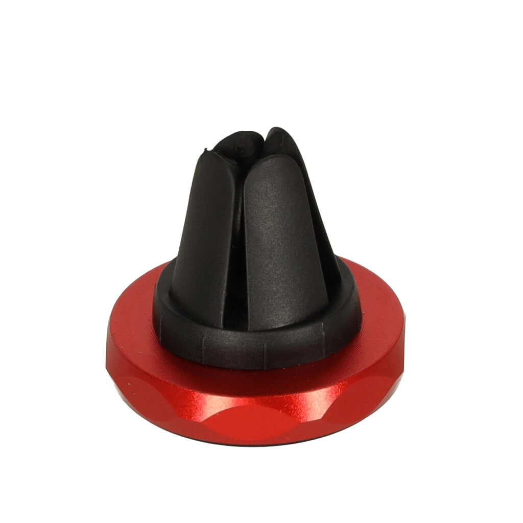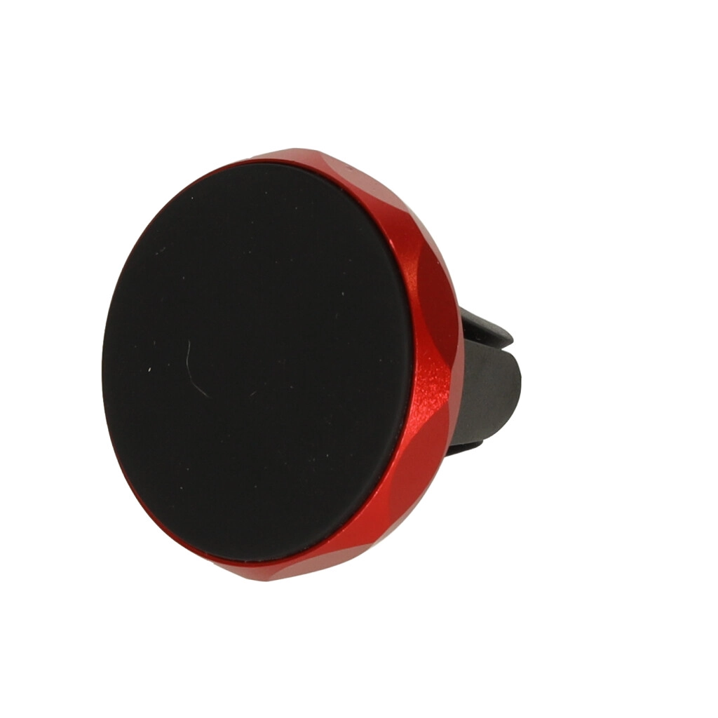 Compacte magnetische telefoonhouder voor het ventilatierooster in de auto met sterke neodymiummagneten voor veilige bevestiging, stabiele montage en eenvoudige bediening met één hand. Minimalistisch design in rood‑zwart dat het zicht niet belemmert en vrij draaien van de telefoon mogelijk maakt.