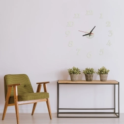 Deze klokset, bedoeld voor zelfmontage, biedt flexibele afmetingen van 70 cm tot 130 cm. De klok is uitsluitend bedoeld voor montage op gladde oppervlakken en werkt op AA-batterijen, die niet bij de levering zijn inbegrepen. Soepel lopende wijzers zorgen voor een nauwkeurige tijdmeting.