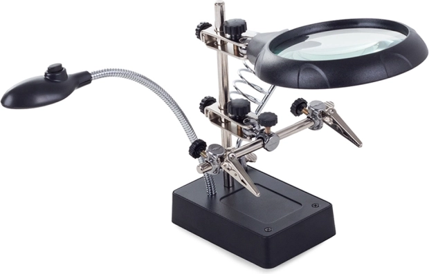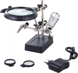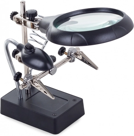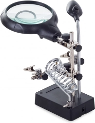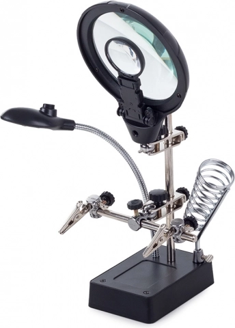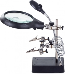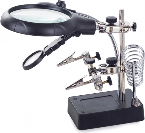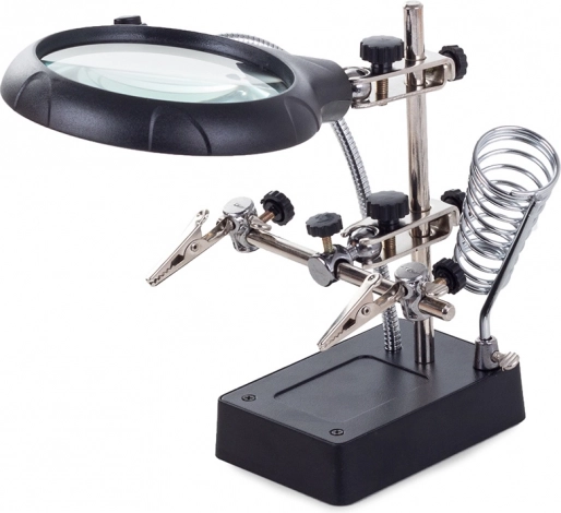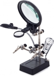 Deze montagehouder “derde hand” is een onmisbare hulp voor elektronicamonteurs, juweliers en modelbouwers. De grote loep 2,5× (90 mm), aangevuld met twee extra lenzen 7,5× en 10×, biedt een helder en scherp beeld. LED-verlichting op een flexibele zwanenhals verlicht het werkgebied precies waar nodig.