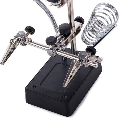 Sterke krokodillenklemmen en verstelbare armen houden het werkstuk stevig vast. De spiraalvormige houder legt de soldeerbout veilig weg tijdens het werken.