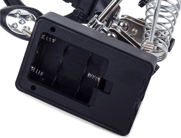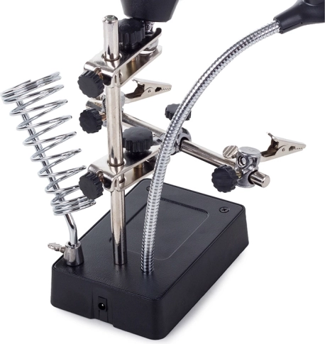Robuuste metalen armen met sterke krokodillenklemmen en volledig verstelbare scharnieren fixeren kleine onderdelen. Een stabiele basis met ruimte voor een puntreiniger en een spiraalvormige soldeerbouthouder zorgen voor een veilige en overzichtelijke werkplek. Voeding is mogelijk via 3× AA (niet inbegrepen) of de meegeleverde voedingsadapter 5 V / 1 A.