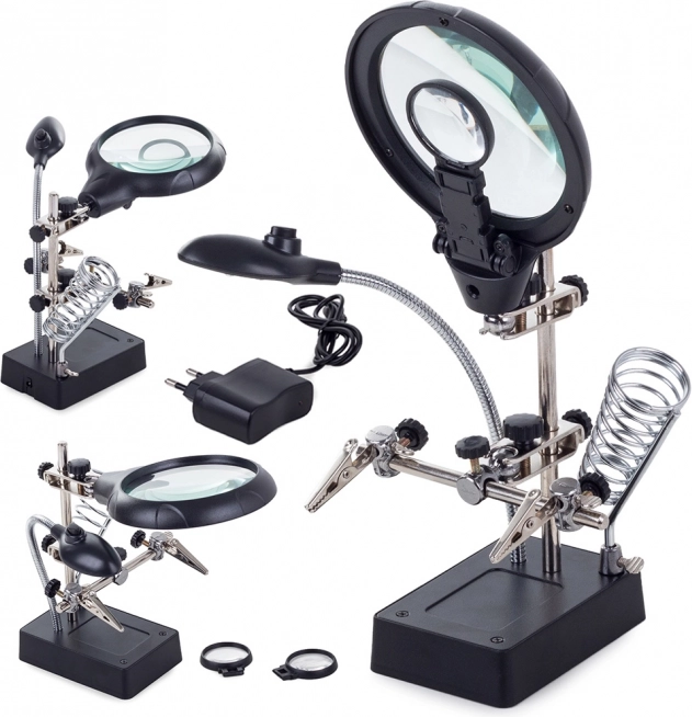 Praktische derde hand met grote loep 2,5× (90 mm), twee aanvullende lenzen en 5× LED-lampjes voor nauwkeurig solderen, lijmen en repareren. De stabiele basis, sterke krokodillenklemmen en flexibele scharnieren zorgen voor een stevige fixatie van onderdelen, terwijl de spiraalvormige soldeerbouthouder en de mogelijkheid tot voeding via AA-batterijen of adapter het comfort en de veiligheid verhogen.