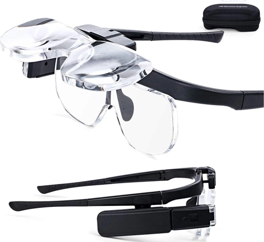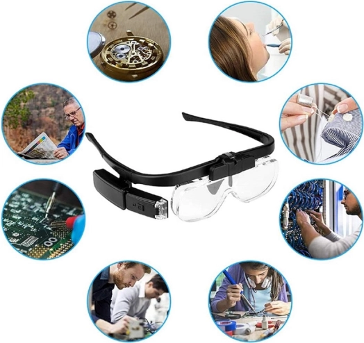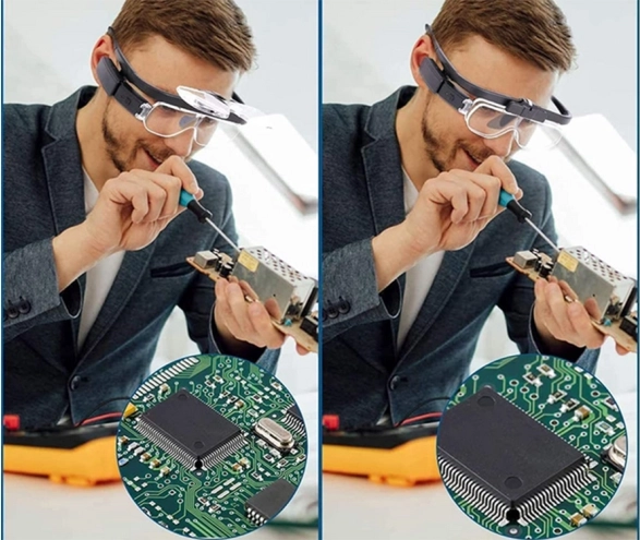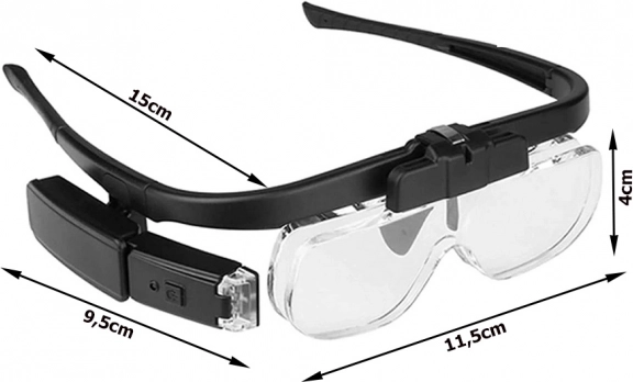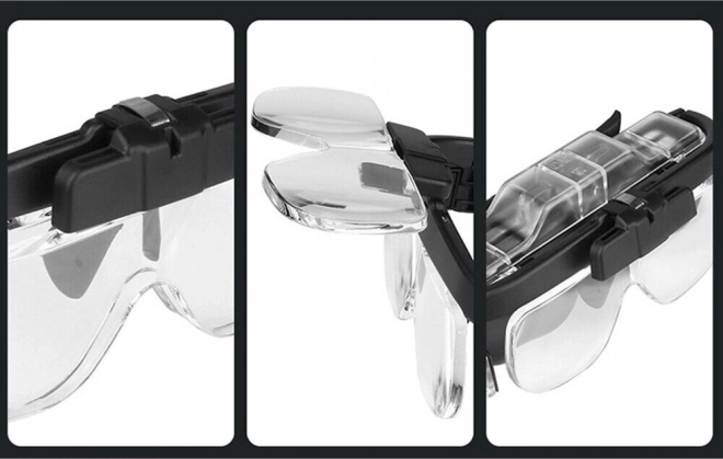 De hoofdloupe met bril-achtige constructie houdt je handen vrij en zorgt voor een stabiele blik op details. De drie verwisselbare lenzen 1,5x / 2x / 2,5x kun je combineren tot hogere vergrotingen 3,5x / 4,0x / 4,5x, zodat je de prestatie eenvoudig aanpast aan de huidige taak. Het duo krachtige LED-diodes met instelbare lichtrichting verlicht het werkoppervlak gelijkmatig.