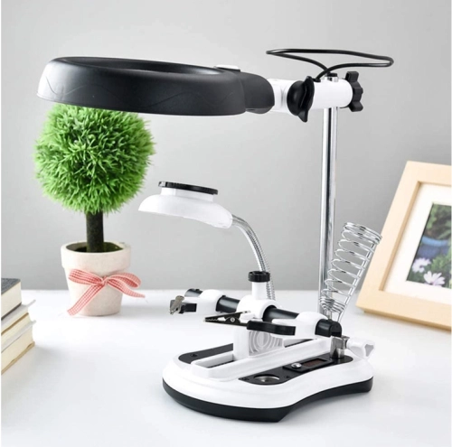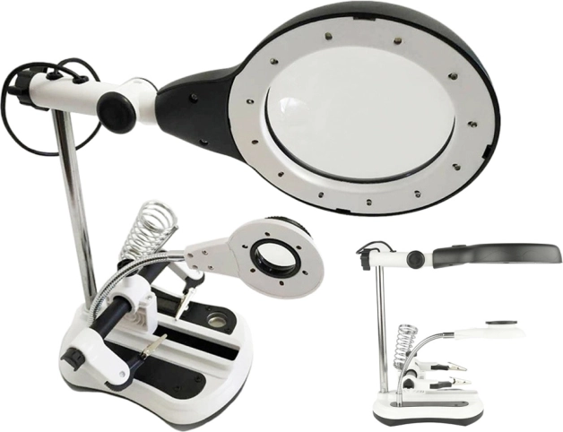 Multifunctionele loep met derde-hand houder voor nauwkeurig solderen en repareren. Biedt 2,5x/5x/6x/10x vergroting, 12 + 6 LED's met twee lichtstanden en een stabiele basis met organizers. Dankzij de verstelbare armen, krokodilklemmen en soldeerbouthouder ideaal voor elektronica, horlogemakerij en fijn modelbouwwerk.
