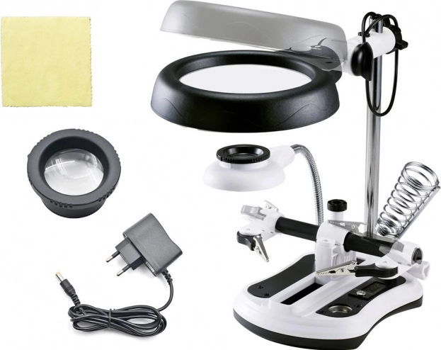 - Loep met derde hand, vervanglens, voedingsadapter, glasdoekje, originele verpakking