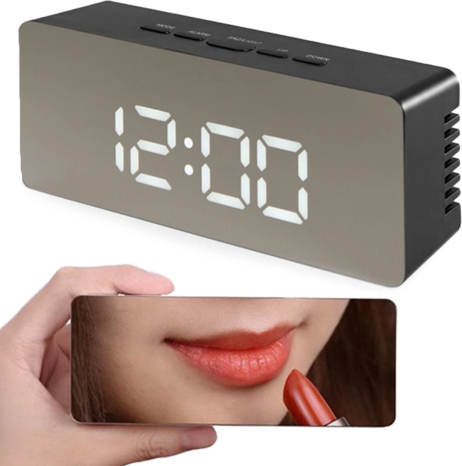 De stijlvolle LED wekker combineert praktische functies met een modern uiterlijk. Het spiegeloppervlak van het display is handig voor een snelle lookcheck, de helderheid is instelbaar zodat de wekker ’s nachts niet stoort en overdag perfect leesbaar is. Het overzichtelijke LCD toont de tijd in 12/24 u-formaat, de datum en de temperatuur in °C of °F.