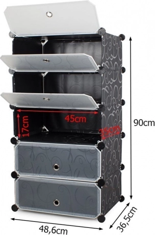 De schoenenkast heeft 5 planken die flexibel kunnen worden gestapeld of naast elkaar geplaatst, afhankelijk van ruimte en behoefte. De constructie is licht en stabiel, wat de handling en montage vergemakkelijkt. Dankzij de transparante vensters vindt u snel en makkelijk wat u zoekt. Het materiaal van de kast is waterbestendig en kan zonder problemen worden gereinigd.