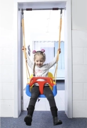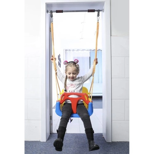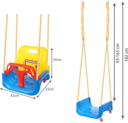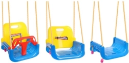 Deze kleurrijke 3-in-1 schommel is een geweldige keuze voor peuters en oudere kinderen. In de configuratie met T‑bar en hoge rugleuning vervoert hij de kleintjes veilig; later kun je de voor- en achterdelen verwijderen en hem omtoveren tot een klassiek zitje. Verstelbare veiligheidsgordels houden het kind stevig vast, terwijl de antislipstructuur van het zitje wegglijden voorkomt, ook bij uitbundig speelplezier.